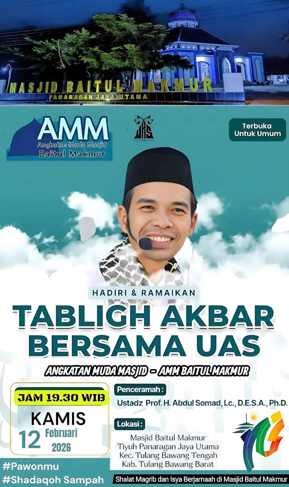 Tabligh Akbar tersebut dijadwalkan berlangsung pada Kamis, 12 Februari 2026, pukul 19.30 WIB. Di pelataran Masjid Baitul Makmur. Kegiatan ini diproyeksikan menjadi magnet jamaah dari berbagai wilayah di Tubaba dan sekitarnya, mengingat besarnya antusiasme masyarakat terhadap dakwah UAS.