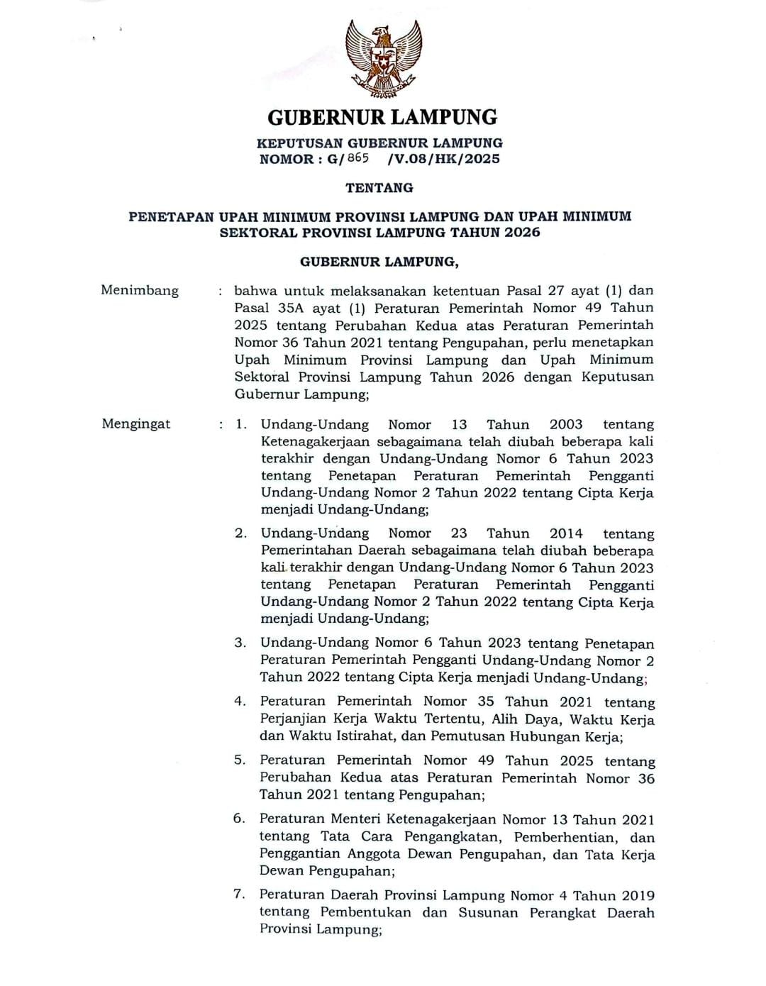 Ketetapan tersebut tertuang dalam Keputusan Gubernur Lampung Nomor: G/865/V.08/HK/2025 tentang Penetapan Upah Minimum Provinsi Lampung dan Upah Minimum Sektoral Provinsi Lampung Tahun 2026.