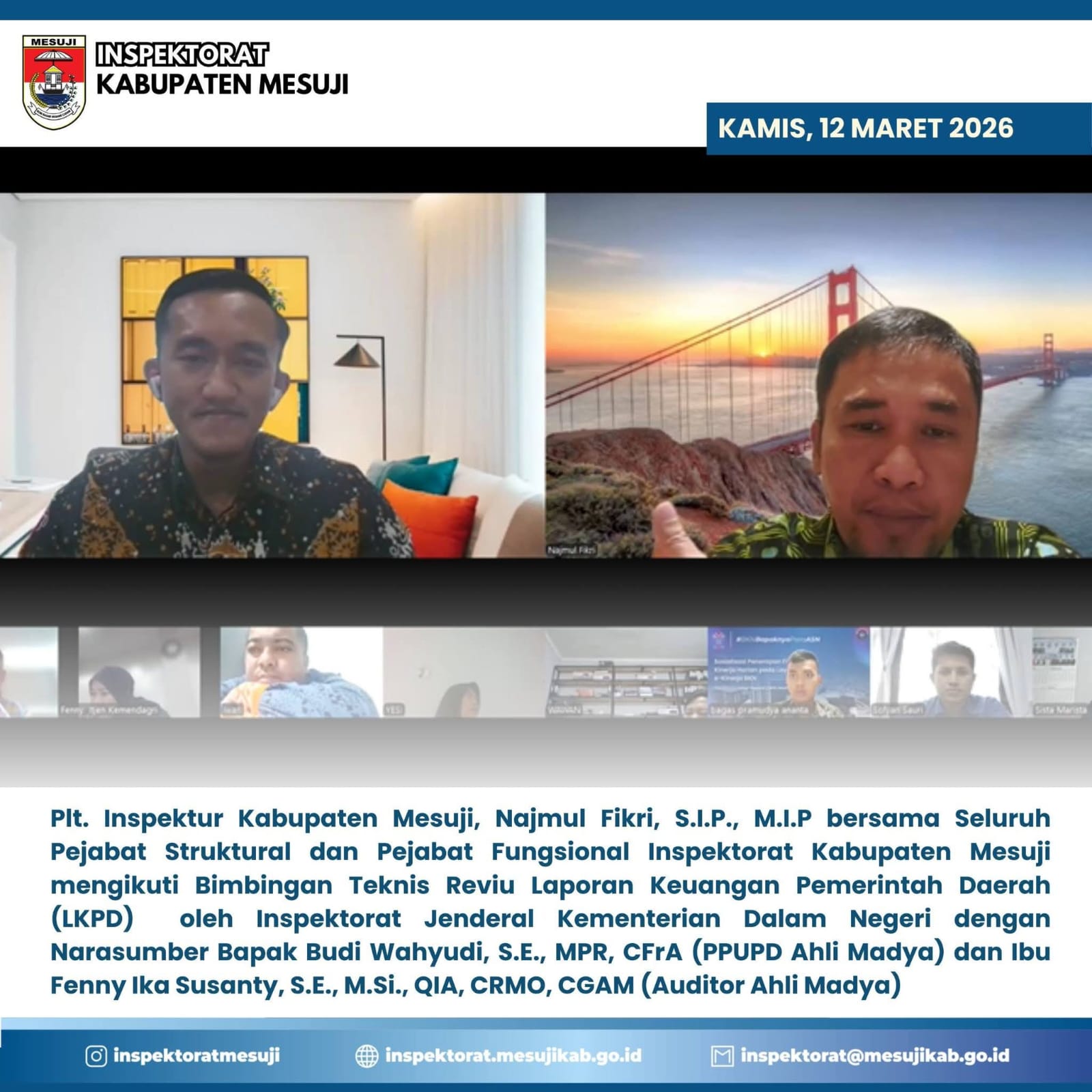 ​Kegiatan yang diinisiasi oleh Inspektorat Jenderal Kementerian Dalam Negeri (Itjen Kemendagri) ini diikuti langsung oleh Plt. Inspektur Kabupaten Mesuji, Najmul Fikri, S.I.P., M.I.P., bersama seluruh Pejabat Struktural dan Fungsional secara daring melalui platform Zoom Meeting.