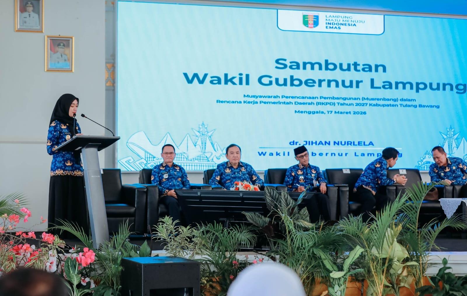 PIJAR MEDIA, TULANG BAWANG — Wakil Gubernur Lampung Jihan Nurlela membuka Musyawarah Perencanaan Pembangunan (Musrenbang) RKPD 2027 Kabupaten Tulang Bawang di GSG Menggala, Selasa (17/3/2026), dengan menekankan pentingnya sinergi lintas pemerintahan dan pertumbuhan ekonomi yang berkualitas.